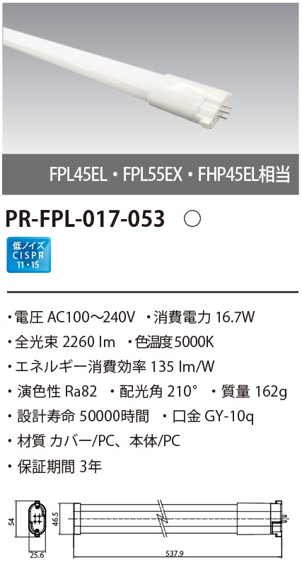PR-FPL-017-053は、既存のコンパクト蛍光灯の代替省エネLED ランプです。既存の蛍光灯と置き換えるだけで、電気代最大70% の省エネ化が図れます。高い照度が必要なオフィス・商用スペース・医療機関などでもご利用いただけます。