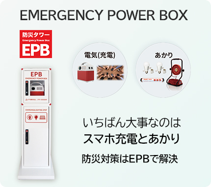 地震や台風、系統電力ネットワークの周波数混乱による停電等、複雑化する災害を原因とした停電への備えを高める必要があります。EPBは、非常時の分散用の電源として、スマートホンの充電やノートパソコン等の利用を継続することができ、あかりや投光器など、必要最低限の機能を備えた設備です。また、企業が防災への取り組みを具体的に具現化し、ステークホルダー(従業員、取引先、顧客)への姿勢を示すことができます。